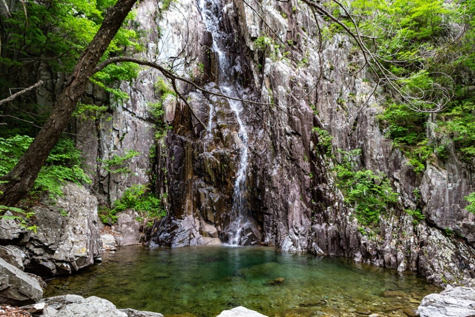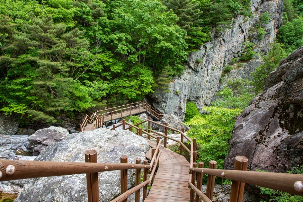2km계곡 양쪽에 수십m의 높은 절벽이 솟아있고 그 계곡은 바닥이 선명히 드러나는 맑은 옥류계곡이 흘러 절경의 극치를 이룬다.