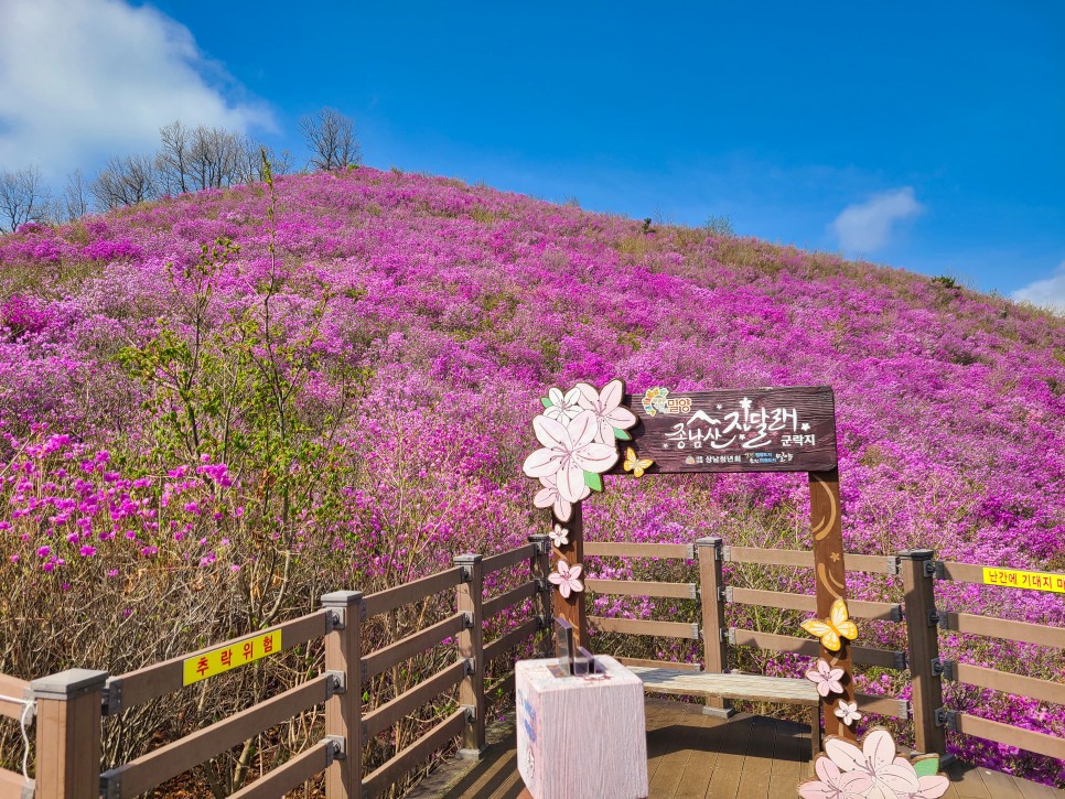 산행을 시작해 3시간 정도 땀 흘려 오르면 밀양 시가지와 낙동강 들녘이 한눈에 들어오는 능선에 올라선다. 여기서 조금 더 오르면 진달래 군락지인 정상부다. 봄이면 만발하는 어른 키가 훌쩍 넘는 진달래는 그야말로 장관을 이룬다. 산행을 하다 보면 임도와 만나는 곳이 많아 길 찾기가 쉽고 언제든지 하산할 수 있어 초보자들이 등산하기에도 좋은 곳이다. 우령산(중봉)으로 가는 길은 암릉 구간이 있어 주의가 필요하지만 암릉을 우회할 수 있다.